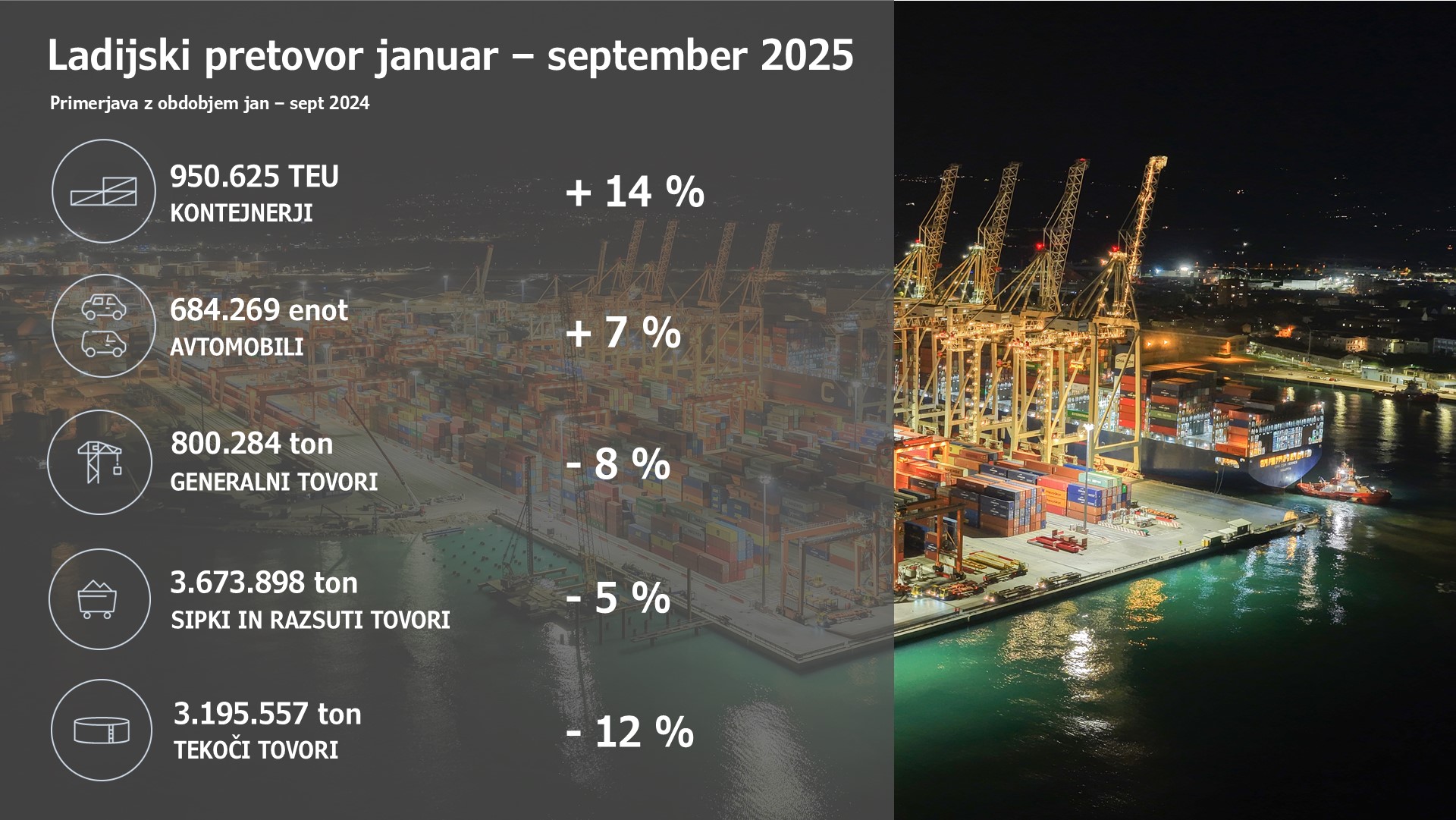 Na kontejnerskem terminalu bomo leto predvidoma sklenili s pretovorom 1.238 tisoč TEU, kar je za 9 odstotkov več od doseženega v letu 2024, medtem ko naj bi pretovor avtomobilov dosegel 907 tisoč enot in presegel pretovor lanskega leta za 3 odstotke. Skupni ladijski pretovor do konca leta 2025 naj bi po oceni dosegel 22,7 milijona ton, kar je 1 odstotek manj od doseženega v letu 2024 in 2 odstotka pod načrtovanim pretovorom za leto 2025, predvsem zaradi nekoliko nižjega pretovora generalnih, sipkih in razsutih tovorov.